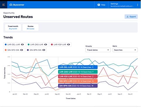 Skyscanner, Travel Insight Vision için yeni bir çözüm olarak bu yıl "Unserved Routes" modülünü piyasaya sürdü. Uçuş programlarını gezgin talep trend verileriyle birleştirerek, direkt uçuşların olmadığı rotalar hakkında bilgi sağlar. Toplu taşıma rotası arama sonuçlarını, talebi, oranları, dönüşüm oranlarını ve daha fazlasını analiz edin.